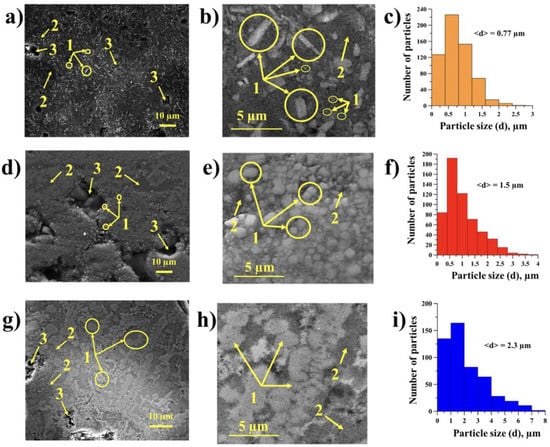 Backscattered SEM images of the SHS products and distribution of TiB2 particles in the SHS products obtained from the Al-Ti-B powder mixture after: (a–c) 60 s, (d–f) 180 s, and (g–i) 900 s of mechanical activation. Region 1: TiB2 particles; region 2: aluminum matrix; region 3: pores.