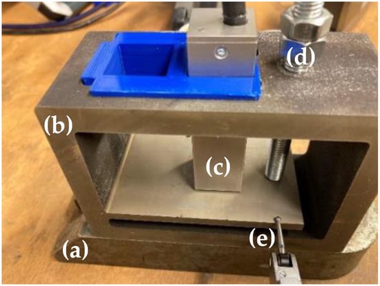 Bending beam method setup: (a) supporting plate; (b) setup manufactured with LPBF; (c) flat BNA sensor; (d) screw; (e) deflection measurement gauge.