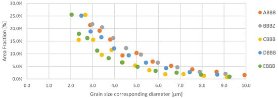 Overall, the grain size distributions showed good stability with variation in the laser power input in the plane considered. Although differences can be observed between the series, a power function fits the whole data set with an R2 of 0.88, indicating comparably stable grain size between samples, as shown in Figure 2. Hence, it can be considered that the relatively stable microstructures throughout the different samples considered in this study allow for the interpretation of changes in Barkhausen noise signal as changes in the stress states of the 1.2709 samples