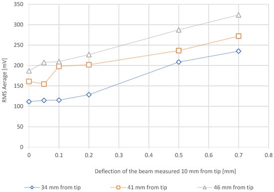 Figure 3 shows the linear response of the flat sensor to the application of a mechanical load on a simple beam. The linear behaviour of the Barkhausen noise RMS average signal is as expected because the beam theory predicts a linear increase in the stresses for a given beam position with a linear increase in applied force. The R2 coefficients for a linear fit are 0.97, 0.93 and 0.99 for the measurements at 34, 41 and 46 mm from the tip of the beam, respectively. In addition, for a known load, the sensor position also shows expected behaviour. Indeed, as the sensor becomes further from the tip of the beam, the signal increases along with stresses in the beam. However, these results also highlight the high sensitivity of the measurement technique, as the theoretical behaviour should be represented by three parallel lines with distances between each one proportional to the distance increase from the tip of the beam. However, the curves of the sensor response tend to be more stable with higher bending of the beam, suggesting that the measurement is more appropriate for relatively higher stress states or high variations. The bending beam method highlights that the LPBF-processed 1.2709 steel is a suitable material for the application of BNA to quantify the stress states of the material qualitatively.
