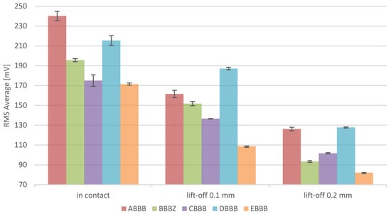 RMS average of different LPBF samples measured for in-contact measurements and lift-off measurements at 0.1 and 0.2 mm, where magnetic field is parallel to the last layer scanning direction.