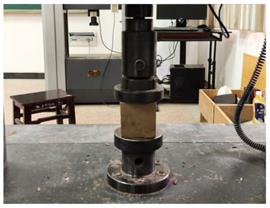 According to the experimental method in [39], the 3, 7, and 28 d UCS values of the stabilized soil specimens were tested by a universal testing machine, as shown in Figure 1.