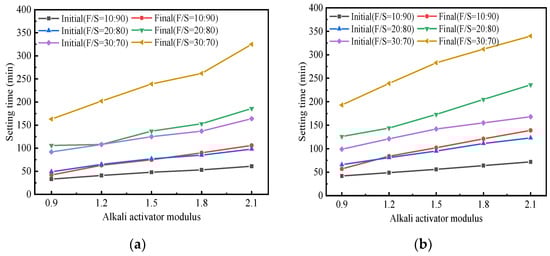 As shown in Figure 2, in the one-step method, the modulus of the NaOH-modified Na2SiO3 solution was also one of the important factors affecting the setting behavior of geopolymer-stabilized soil [50,51]. The specific phenomenon was that the setting time of stabilized soil increased gradually with the alkali activator modulus. This was because the activator with higher modulus had a higher viscosity which reduced the migration rate of alkali metal cations and weakened interactions between the reacting species, thereby decreasing the geopolymerization rate and prolonging the setting and hardening time [52].