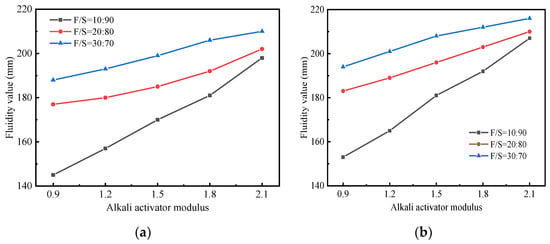 - The development trend of the setting time of the fly ash and slag-based geopolymer-stabilized soil was identical to the fluidity. The setting time and fluidity values of the stabilized soils prepared by the one-step method were slightly lower than those prepared by the two-step method. With increases in of the modulus of the alkali activator or the proportion of fly ash, the setting time of stabilized soil was gradually prolonged, and the fluidity increased.