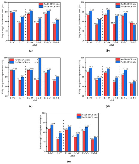 Figure 4 shows the UCS development trend of geopolymer-stabilized soils under different preparation methods. It can be seen from Figure 4a–e that the early strength development rate of the stabilized soil prepared by the one-step method was significantly higher than in those prepared by the two-step method. In the O series, the 3 d/28 d UCS ratios of stabilized soil were 62.43–78.60%, and the 7 d/28 d UCS ratios were 70.37–83.63%. For the T series, the 3 d/28 d UCS ratios of stabilized soil were 44.93–57.61%, and the 7 d/28 d UCS ratios were 49.27–71.12% (excluding individual values). This indicated that the early strength of the geopolymer-stabilized soil prepared by the one-step method developed relatively fast, and also obtained a higher later strength. This was because the higher ambient temperature facilitated geopolymerization, which in turn increased the compaction of the stabilized soil. At the same time, it was found that a lower alkali activator modulus and lower F/S value also acted synergistically, along with high ambient temperatures, on the strength development of the stabilized soil. Their corresponding specimens had better mechanical properties. Additionally, the 3 d/28 d UCS ratio of II-3-T was 53.59%, while the 7 d/28 d UCS ratio reached 98.90%. The later strength of II-3-T showed almost no increase and was lower than that of the adjacent groups, II-1-T and II-2-T. This showed that the UCS development of stabilized soil prepared by the two-step method was unstable.