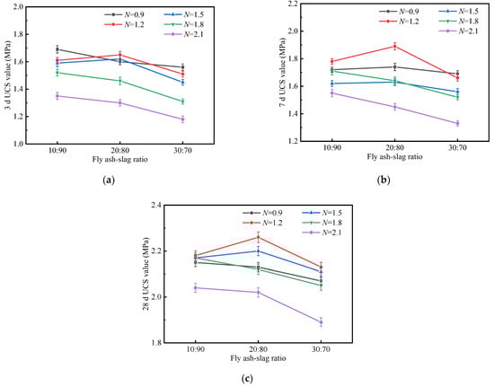 UCS value of stabilized soil with different fly ash/slag ratios: (a) 3 d; (b) 7 d; (c) 28 d.