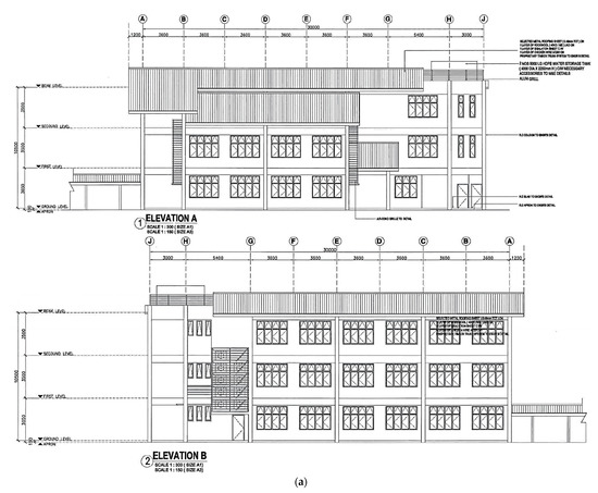 The technical documents, such as full-scale building Elevation A and Elevation B, are shown in Figure 4a. This is a school building where the technical drawings and designs documented by (Public Work Department) local authorities are owned by Wonderful Engineering & Construction Sdn. Bhd. Due to the frequent tremors from neighbouring countries, the building owner worried it might pose certain risks or building damage due to the tremors, which led to this research study. The building owner proposed the study of the parameter frame of the building highlighted in the red box, 7.2 m in span and 3.5 m in height. The first limitation occurs where the structure has a beam size of 31 mm in width by 75 mm in depth and a column size of 40 mm in width by 40 mm in breadth with a centre-to-centre beam span of 790 mm, utilising a scale factor of 1:9. Moreover, 4 pad footings were constructed at each of the columns with dimensions of 175 mm in width by 175 mm in breadth by 40 mm in height for fastening the shaking table platform. The slabs covering the first, second, and topmost floors of the structure have dimensions of 830 mm by 830 mm and is 16 mm thick. The second limitation concerns the alternate scale factor of 1:7, which generated a total storey height of 1500 mm with a 500 mm inter-storey height. The different scale factors accommodate the available space of the shaking table machine and the availability of materials in the hardware store to fabricate the scaled buildings. The utilisation of scaled factors has common agreement among researchers [53,54,55], showing promising accuracy of the results.