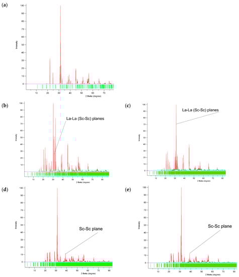 Each interface produces its own powder XRD pattern (Figure 2), clearly distinct from that of the ideal bulk (Figure 2a). The difference is clearly seen even between structurally very similar two face-shared (011) interfaces (Figure 2d,e). The presented XRD patterns indicate that the existence of the antiphase boundaries can experimentally manifest itself on the local diffraction pattern as a structural inhomogeneity with a lower symmetry. The view of the patterns show that locally, these inhomogeneities caused by the APBs can be mixed up with a superstructure domains of higher-order lanthanum–strontium scandates: (SrO)n−1(LaScO3)n [].