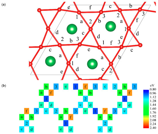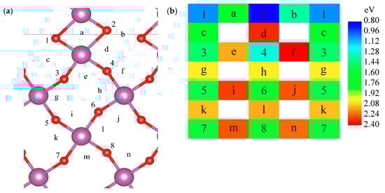 Oxygen vacancy formation energy (numbers) and transition states (letters) within the (011) interface, relative to the ideal interface and 1/2O2 (Equation (2)) (Figure 1d). (a) Indexed crystal structure and (b) schematic view with coloured energy states, relative to the ideal interface and 1/2O2.