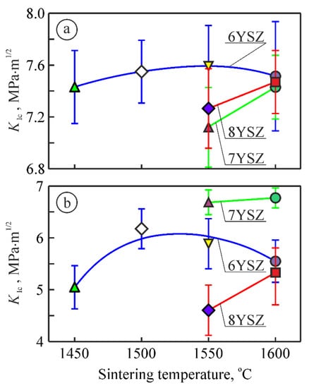 - The fracture toughness of YSZ ceramics is related to the phase transformations occurring in the material in the presence of a stabilizing additive. By comparing the mechanical behaviors of studied material variants, it was found that 7YSZ ceramics sintered at 1600 °C have the highest level of fracture toughness.