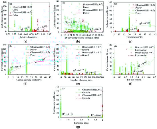 Correlation between each parameter and carbonation coefficient (a–g) are the maximum curve estimation of RH, fc, T, C, D, FA and X and carbonation coefficient respectively.