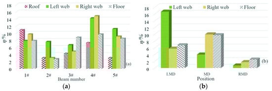 ƞ of chloride concentration at each measuring point of the test box girder; (a) ƞ of RH less than 70; (b) ƞ of RH higher than 70.