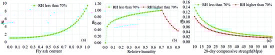 It can be seen from Figure 1 that when RH is less than 70%, the parameters with great correlations with the carbonation coefficient (R2 > 0.4) are FA, C, fc, and RH, respectively. Therefore, the carbonation coefficient can be expressed as: