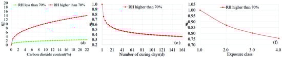From Figure 3a, it can be seen that the influence curve of FA content on the carbonation coefficient is an exponential distribution. When RH ≤ 70%, the carbonation coefficient increases gradually with the increase in fly ash content. When the content of FA is less than 20%, fly ash has almost no effect on concrete carbonation. Under the same environmental conditions, the carbonation depth of concrete with 60% FA content is about 2 times of that of 20%. As shown in Figure 3b, when RH is less than 70%, the carbonation rate of concrete increases gradually with the increase in RH. When RH exceeds 70%, RH will significantly inhibit the carbonation of concrete. When RH increases from 70% to 90%, the carbonation rate of concrete will be reduced by about 4.2 times, and this conclusion is consistent with the literature [13]. The most favorable RH for concrete carbonation is between 56 and 70%, which is consistent with the conclusions within the literature [16,40]. In Figure 3c, the value of fc in two RH environments has the same inhibitory effect on carbonation, and the carbonation depth of concrete with an fc value of 10 Mpa is about 5.6 times of that of an fc value of 65 MPa. The value of fc has an obvious inhibitory effect on the carbonation of concrete. This conclusion is consistent with that of the existing literature. In terms of C, it can be seen from Figure 3d that when RH is higher than 70%, the promotion effect of C on carbonation is more significant. As is shown in Figure 3e, the D value of concrete has an inhibition effect on carbonation. However, when the D value of concrete is more than 28 days, the inhibition of carbonation will be very small. It can be seen from Figure 3f that the carbonation rate of concrete decreases with an increasing environmental X value. When RH > 70%, the carbonation rate is more sensitive to the value of X. When the value of X increased from 1 to 4, the carbonation rate only decreased by about 1.3 times. The inhibition effect of X was not obvious, which may be related to the smaller number of samples.