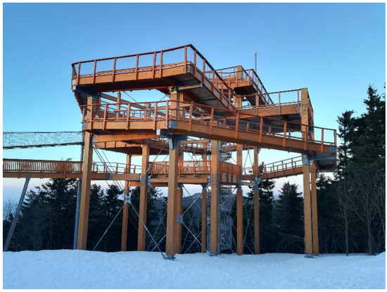 Nowadays, the use of timber as a building material is becoming more important and popular due to the increasing environmental requirements for construction. Timber is used mainly in the construction of prefabricated houses, multistorey buildings, halls, and more recently, engineering structures, such as bridges, footbridges, and lookout towers (see Figure 1).