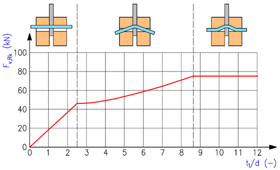 The first term on the right-hand side in the above expressions represents the load-carrying capacity according to Johansen’s EYM (ductile failure modes). The failure mode (f) refers to the embedment in the timber element (typical for fasteners of low slenderness). The failure mode (g) corresponds to the embedment in the timber element together with the formation of one plastic hinge in the fastener. The failure mode (h) corresponds to the embedment in the timber element together with the formation of two plastic hinges in the fastener (typical for flexible fasteners of high slenderness). The slenderness ratio between the thickness of the embedded timber element and the diameter of the fastener t1/d has a huge influence on the failure mode (see Figure 3). The second term on the right-hand side in the above expressions represents the contribution from the rope effect [42], which should be limited to 25% of the Johansen part for bolts. If the contribution from the rope effect is not known, then it should be taken as zero.