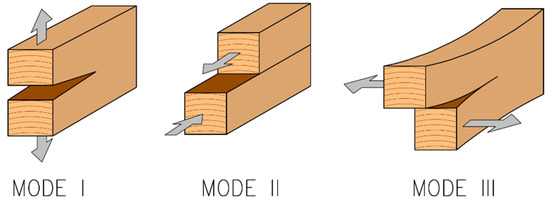 In addition to the standard approach based on EYM, the approach of linear elastic fracture mechanics (LEFM) according to Jorissen [28] can be used. This approach assumes a brittle fracture that occurs as a result of the initiation and gradual propagation of the crack in the contact area of the fastener with the timber. The approach based on LEFM is mainly applied and is often decisive for the failure of dowel-type connections with very stiff fasteners (with a low slenderness ratio t1/d). Fracture mechanics generally recognizes three failure modes (see Figure 4)—mode I (opening mode), mode II (sliding mode), mode III (tearing mode).