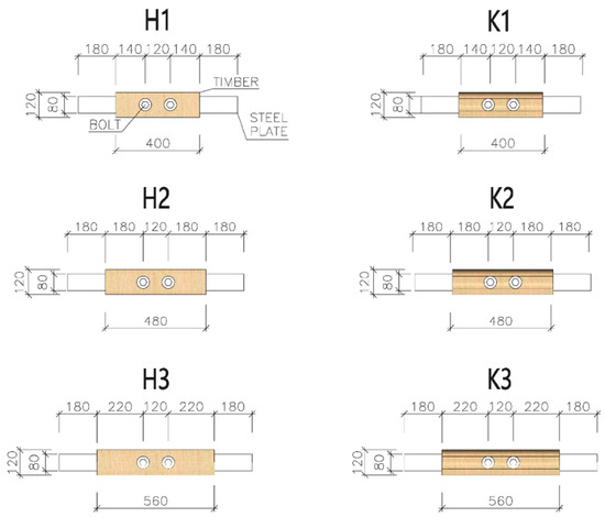 The length of the specimens varied depending on the end distance [46,47]. Specimens of three different lengths were made (see Figure 6)—400 mm (designations K1 and H1), 480 mm (designations K2 and H2), and 560 mm (designations K3 and H3). The circular holes for placing fasteners were created using a drill stand with a drill bit with a diameter of 20 mm.