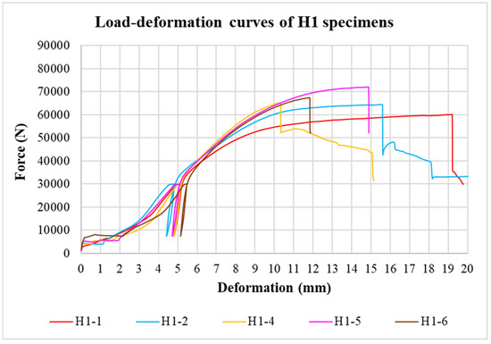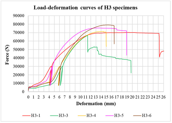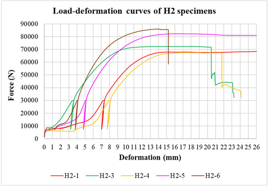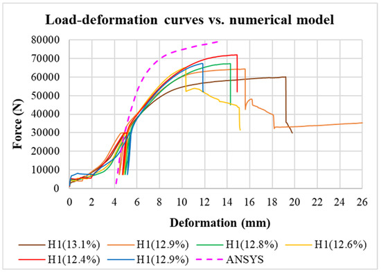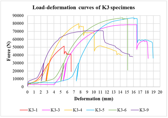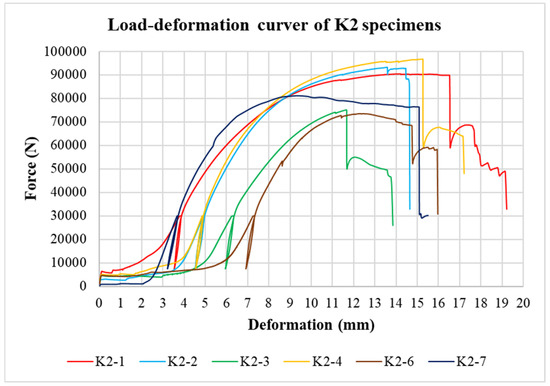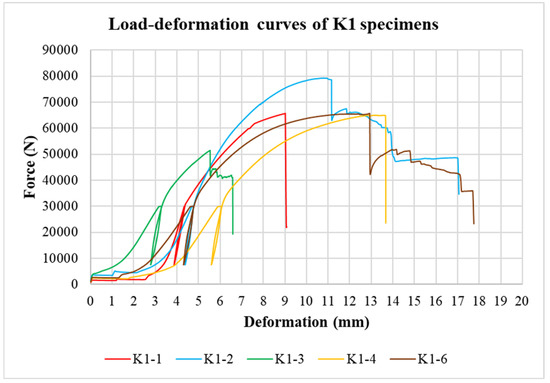 The physical properties of timber were determined by nondestructive methods and subsequently evaluated for all tested specimens. Load-deformation diagrams were recorded during the testing to evaluate the load-carrying capacity and the overall behavior of squared and round timber connections with different end distances. The graphs in Figure 8, Figure 9, Figure 10, Figure 11, Figure 12 and Figure 13 show the load-deformation curves of selected specimens of types K1, K2, K3, H1, H2, and H3. The initial load can be seen at 40% of the estimated maximum force, the subsequent unload at 10% of the estimated maximum force, and the reload up to failure. It is also possible to read the maximum load and the corresponding deformation. The graphs are supplemented with tables summarizing the results. Table 2, Table 3, Table 4, Table 5, Table 6 and Table 7 contain selected statistical quantities for moisture content, bulk density, and experimentally determined load-carrying capacity for individual geometric modifications.