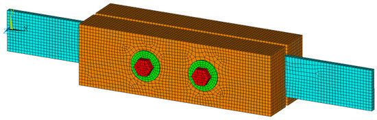 The elastic-plastic material model with linear strain hardening was used for steel (slotted-in steel plates and bolts together with nuts and washers). The value of the hardening modulus corresponded to 1/10,000 of the modulus of elasticity of the elastic part of the stress–strain curve [52]. The modulus of elasticity in tension and pressure of the isotropic material was taken as E = 200 GPa, and Poisson’s ratio μ = 0.3. The yield strength for von Mises yield criterion was set to fy = 235 MPa (plates) and fy = 640 MPa (bolts).