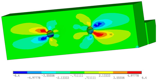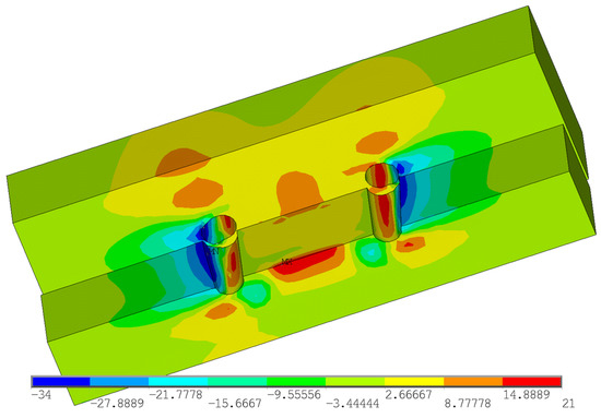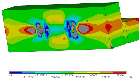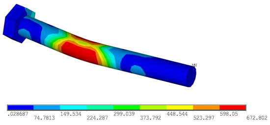 According to the EYM, the load-carrying capacity of the connection in question is governed by the failure mode (g), which represents the embedment in the timber element together with the formation of one plastic hinge in the fastener (see Figure 2). Deformed bolts were observed rarely in the experiment (only few specimens with higher bulk density) due to the use of relatively brittle high-strength steel (see Figure 24). Figure 25 shows the deformation of the bolt from the numerical analysis for comparison. The stress values in MPa are shown on the color scale and correspond to approximately a load of 75 kN. The maximum von Mises stress fmax = 672.8 MPa is higher than the yield strength fy = 640 MPa. It would indicate an irreversible plastic deformation of the bolt.