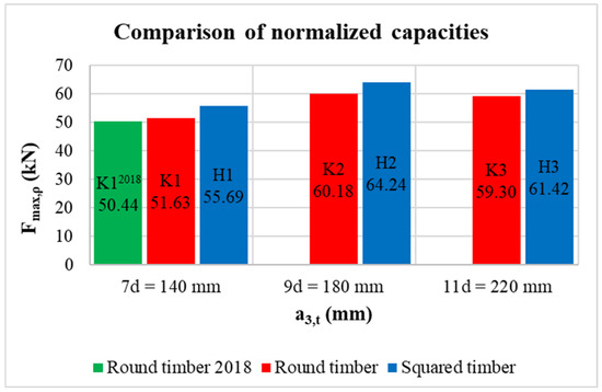 The highest values of the actual load-carrying capacities were surprisingly found for specimens with a medium end distance (specimens K2 and H2). The lowest values were found for specimens with the lowest end distance (specimens K1 and H1). The ratios of the capacities for individual geometric modifications were: K2/K1 = 1.16; K3/K1 = 1.11; H2/H1 = 1.14; and H3/H1 = 1.10. Higher values were measured for round timber specimens, which was due to their higher bulk density compared to squared timber specimens (approximately 9% to 13%). After normalization of the data according to bulk density, higher load-carrying capacities were found for squared timber specimens (see Figure 21). In any case, this figure has to be taken as a guide only, because bulk density is not the only factor that governs the load-carrying capacity. The variable thickness of round timber specimens in width directions can also have an effect on this fact. The almost identical (deviation of approximately 2%) load-carrying capacity of specimens K1 and K12018 was also remarkable, which contributed to the mutual verification of two independent research activities at the Faculty of Civil Engineering, VSB-TU Ostrava.