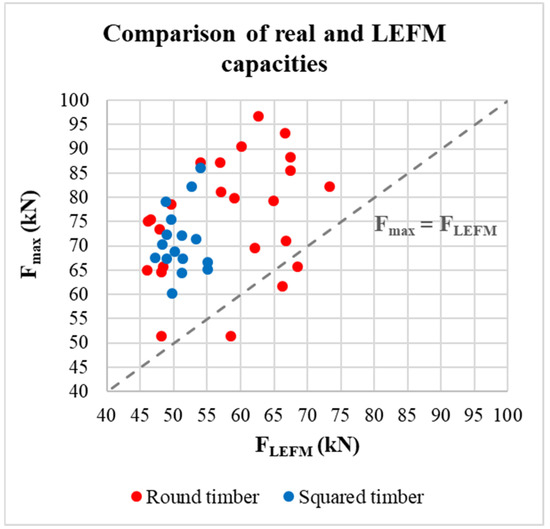 All actual load-carrying capacities were significantly higher than standard estimates representing the ductile failure mode according to EYM, which also confirms the hypothesis that the actual total failure of the connections occurred after the ductile failure. A slight effect on the higher load-carrying capacity could also have a possible rope, which could not be completely eliminated due to friction between the individual components of the connection. The evaluation also confirmed that the standard procedures based on EYM can be safely applied to round timber connections. The actual load-carrying capacities were in most cases (apart from three round timber specimens) also higher than the theoretical values according to the theory of LEFM representing brittle failure (see the graph in Figure 22).