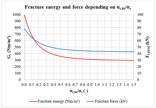The fracture energy and force depending on the ratio of tensile stress perpendicular to the grain to shear stress.