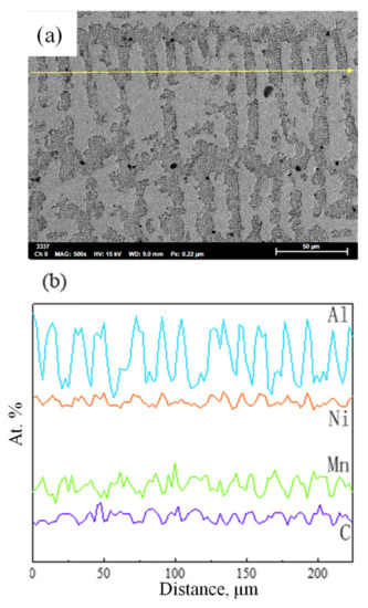 (a) As-cast microstructure of the Fe-15Mn-15Al-5Ni-1C low-density steel; (b) line scan results for the elements Al, Ni, Mn, and C.