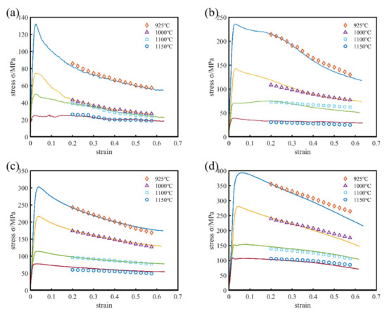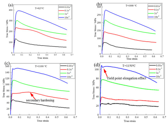 True stress and true strain behavior of hot compression experimental alloys at different temperatures: (a) 925 °C; (b) 1000 °C; (c) 1100 °C; (d) 1150 °C.