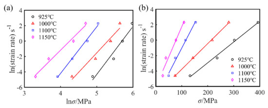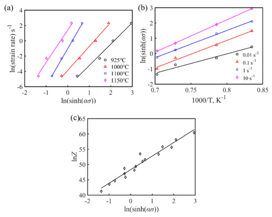 where (s−1) is the strain rate; A (s−1) and α (MPa−1) are material constants; σ is the flow stress, which has the unit of MPa; n is the stress index; R is the universal gas constant, which has the value 8.314 J/(mol·K); T is the thermodynamic temperature (K); and Q is the activation energy of the thermal deformation of the material, which has the unit of kJ mol−1.