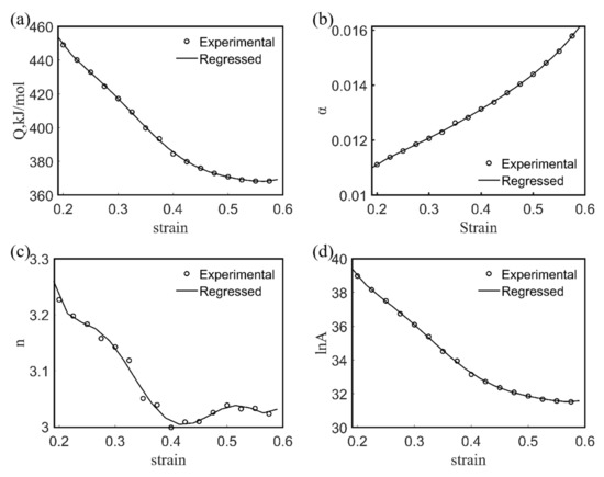 Most previous studies showed that the effect of ε on the deformation activation energy and material constants was significant in a specific range [23,24]; thus, the introduction of the value of the strain ε into the constitutive equation should be considered. Equation (9) employs a sixth-order polynomial function to characterize the relationship between the α, n, Q, and lnA values of the Fe-15Mn-15Al-5Ni-1C low-density steel as functions of the value of the strain ε [25]. Figure 7 gives the results of fitting the deformation activation energy Q and the values of material constants α and A, as well as the stress index n with the value of ε. The results of the fit shown in Figure 7 are given in Table 3, which were used to determine the constitutive equations influenced by the strain variables, as described in Equation (10).