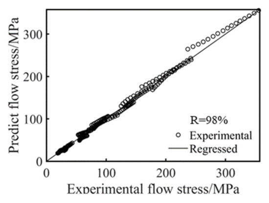 Figure 9 shows a comparison of the predicted and actual stress values. As can be seen from Figure 9, the correlation coefficient (R) between the experimental and predicted flow stress values was 98%. The experimental and predicted data for this range of heat deformation conditions had a high degree of agreement in the overall case, which meant that the constructed constitutive equation had good predictive capability.