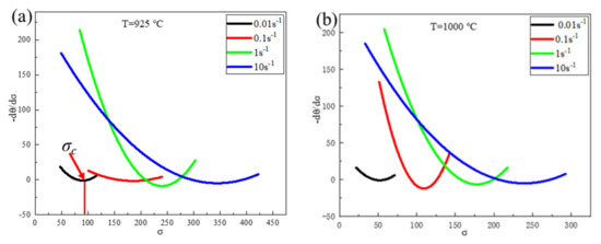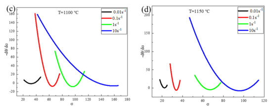 Figure 10 shows the σ–(–dθ/dσ) curves for the Fe-15Mn-15Al-5Ni-1C low-density steel under different deformation conditions. From Figure 10, it can be observed that there were minima in the σ–(–∂θ/∂σ) curves for different deformation conditions corresponding to the value of σc for DRX that occurred in the Fe-15Mn-15Al-5Ni-1C low-density steel. At the same deformation temperature, the critical stress value for DRX occurring in the Fe-15Mn-15Al-5Ni-1C low-density steel increased as the strain rate increased.