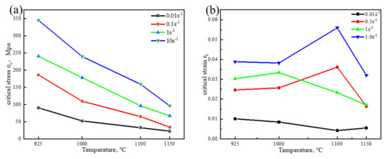 Critical condition versus deformation temperature curves of DRX for the Fe-15Mn-15Al-5Ni-1C low-density steel. (a) σc–T curve; (b) εc–T curve.
