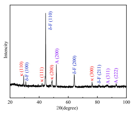 Figure 12 shows the XRD pattern of this low-density steel at a deformation temperature of 1150 °C and a strain rate of 1.0 s−1. As shown in Figure 12, this low-density steel mainly contained δ-F, A, and κ carbides.