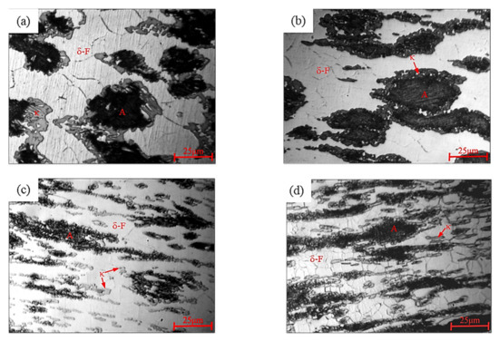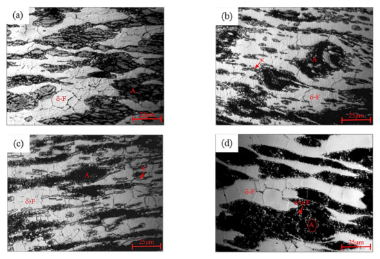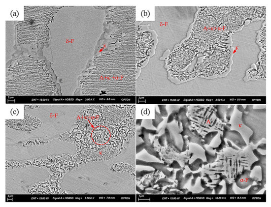 As shown in Figure 13, the steel consisted mainly of A and banded δ-F. At a deformation temperature of 1100 °C, δ-F caused DRX behavior, where the strain rate increased from 0.01 s−1 to 10 s−1 and the size of the δ-F grains decreased from 15 μm to 8 μm due to insufficient time for growth; meanwhile, the DRX behavior of A was not obvious and decomposed into α-ferrite (α-F) and κ carbides. As shown in Figure 13a, the δ-F grains were larger but more uniform in size under a 0.01 s−1 deformation condition. κ carbide nucleates grew at the A and δ-F phase boundary, resulting from a form of intergranular precipitation, where the strain rate was slow and the κ carbides had sufficient time to grow. As seen in Figure 13b, where the strain rate increased to 0.1 s−1, κ carbides also precipitated at the δ-F grain boundaries. In Figure 13c, for a strain rate of 1.0 s−1, the δ-F was banded, and due to the higher deformation temperature, the grain boundary of δ-F migrated, splitting A into island-like microstructures, with a large amount of κ carbides precipitating at the A and δ-F phase boundaries or δ-F grain boundaries. As shown in Figure 13d, when the strain rate increased to 10.0 s−1, the δ-F grains varied in size and morphology and appeared to be polygonal in character. Long stripes of κ carbides were present at the δ-F grain boundaries.