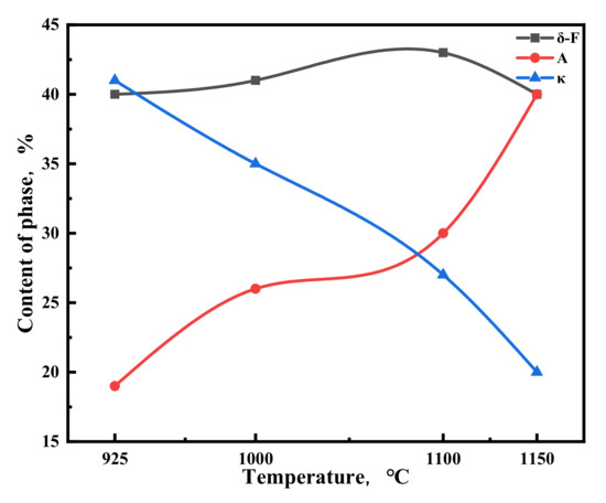 Figure 15 shows the percentage of each phase in the microstructure of Fe-15Mn-15Al-5Ni-1C steel at different deformation temperatures at a strain rate of 10 s−1. As shown in Figure 15, excluding the absolute errors in local sampling, the hot deformation temperature has little effect on the δ-F content during the increase from 925 °C to 1150 °C. The opposite pattern of change in the content of A and κ carbides with the increase in hot deformation temperature occurred, which was due to the enhanced solid solution effect of Fe-15Mn-15Al-5Ni-1C steel with the increase in hot deformation temperature, where the κ carbides solid solution transformed into A, making the content of A increase, while the content of κ carbides decreased.