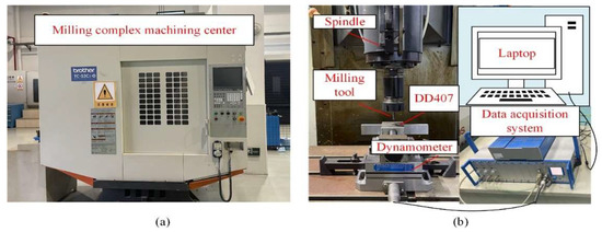 All milling experiments were carried out on a four-axis milling complex machining center (TC-S2Cz/-O, Brother, Nagoya, Japan) displayed in Figure 2, which has a maximum spindle rotational speed of 6000 rpm. Integral end milling tools of GM-4E coated with TiAlN by PVD were chosen in this study. The milling speed (vs), tool feed per tooth (fz), and milling depth (ap) employed in the experiments were 37.7 m/min, 0.013 mm, and 0.18 mm, respectively. The milling experiments were carried out along different directions of [010], [470], [110], and [100] on the (001) plane. During milling of the DD407 superalloy, minimal quantities of lubricant (MQL) cooling method were adopted with a YSHT-MQL2551A (Foshan, China) supplier of dual atomized nozzles, and the cooling oil is KS1106 MQL (Shanghai, China)oil supplied by KINS. The nozzle tilt angle to horizontal and spray distance were set as 30° and 80 mm, respectively. The air pressure and oil droplet flow rate were kept at 0.5 MPa and 80 mL/h, respectively.