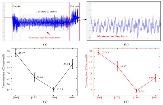 Figure 4 depicts milling forces along different crystal directions on the (100) plane of the DD407 superalloy. It can be seen that the milling forces fluctuated in a range of 15.23 to 47.97 N in the X direction and 9.64 to 20.83 N in the Z direction, feeding along crystal directions designed in this experiment. The milling force along the [110] crystal direction is the lowest among all directions and gradually increased along the [110] to [100] crystal directions as well as [110] to [010] crystal directions.