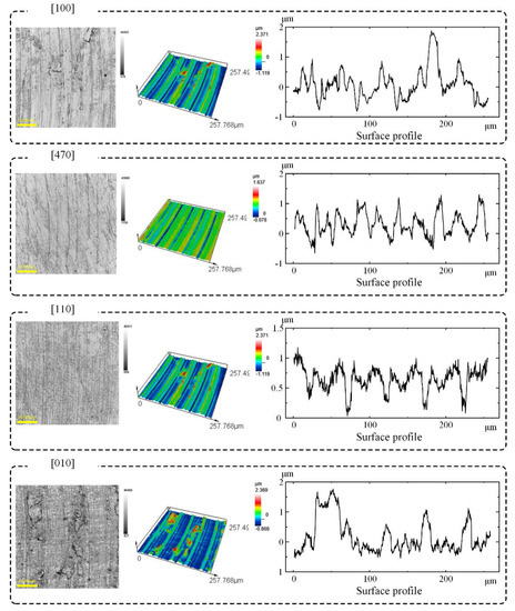 Figure 5 and Figure 6 show morphological profiles and the measured surface roughness of the slot bottoms machined along different crystal directions. From the curve of the roughness vs. crystal direction, it can be seen that it has a similar trend to the curve of the milling force in Figure 4. The surface roughness of [110] is the best, while the surface roughness of [100] is the worst. The surface roughness after milling depends on the shear modulus in the feeding direction. For the milling on the (100) plane of FCC materials, the shear modulus can be written as [23]: