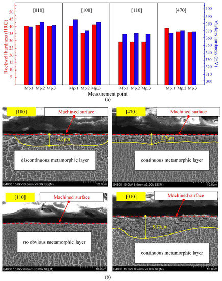 When feeding along [100] crystal direction, a discontinuous metamorphic layer of about 4.3 μm in depth appeared in the subsurface as depicted in Figure 7b, arising from the thermal and mechanical coupling action during milling. With further turning the milling direction into [470] and [010] crystal direction, the metamorphic layer became continuous and not uniform in depth. The evolution of microstructure in the subsurface will absolutely pose an influence on its mechanical performance.