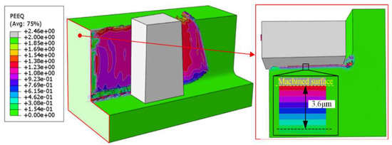 To reveal the underlying mechanism of hardness variation in the subsurface after milling [27], finite element modeling (FEM) by a commercial Abaqus software was adopted to simulate the strain field distribution under maximum feed per tooth. From the FEM analysis results presented in Figure 8, it can be observed that the simulated thickness of the strain-affected layer is 3.6 μm. Therefore, it is reasonable to conclude that the strain hardening effect mainly impacts the subsurface with several micrometers, while the thermal softening effect dominates the hardness in the subsurface with larger depth, resulting in the effect of “hardening-softening-hardening” displayed in Figure 9.
