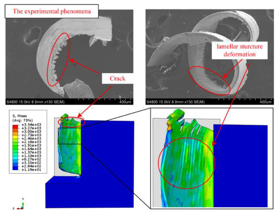 Considering the oblique cutting model, the chip motion vector is not along the normal direction to the main cutting edge on the cutting plane, induced by the existence of helix angles and junk shots. This will make the interaction and relative motion appear between chips and the rack face of the tool, resulting in massive residual tensile stress accumulated in the chip matrix along the cutting depth direction. It can be clearly observed that plastic deformation and flow occurred during the adiabatic shear process of the chip.