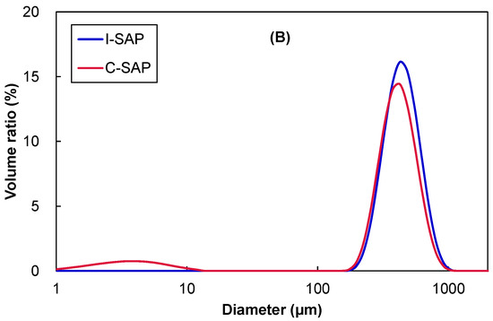 The cumulative volume and particle size distribution of the SAP particles used in the water absorption experiments are shown in Figure 1. Although approximately 10% of C-SAP were 10–100 μm in size, the main peak for both SAPs was approximately 400 μm. This indicates that both SAPs have particles ranging from 200 μm–1 mm. The water absorption rate of SAP was reported to depend on the particle size, which have an inverse relationship [42]. However, the particle size distributions of both SAP particles used in this study were nearly equal.