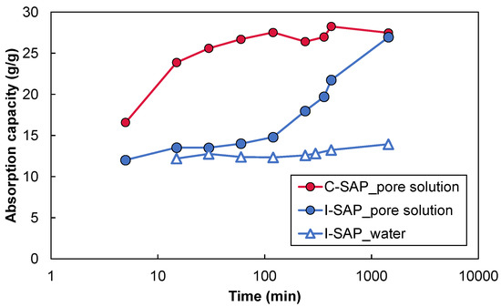 The water absorption behaviour of the SAP particles in the synthesised pore solution and deionised water is shown in Figure 2. Both C-SAP and I-SAP rapidly absorbed the pore solution for up to 5 min. Afterwards, the absorption ratio in C-SAP gradually increased and then remained stable after 100 min (consistent with the experimental results reported [42]). However, water absorption and swelling were suppressed from 5 min to approximately 100 min in I-SAP and then significantly increased. After 1 d, I-SAP absorbed and increased the absorption at the same level as that of C-SAP. The water absorption rate was influenced by the particle size and surrounding solution [11,21,42]. The water absorption behaviour of I-SAP in deionised water was different from that of the pore solution: I-SAP absorbed deionised water for 5 min, and afterwards it did not absorb for 24 h. The total deionised water absorption of I-SAP at 24 h was approximately half that of the pore solution. This result was contrary to the general nature of the water absorption of SAP, where SAP absorbs more water in deionised water than in the pore solution [43]. In general, the water uptake mechanism of SAPs is based on the dissociation of metal ions as water molecules enter the SAP, which ionises and negatively charges the hydrophilic groups, resulting in the formation of a concentration chain between the solution in SAP and external solution. It has been reported that the continuous flow of external solution into the SAP eventually results in a hydrogel [33,44]. The water absorption rate of SAP increases 200 to 1500 times in deionised water [21], but it decreases in high ionic strength and high pH solutions [45,46,47]. In a pore solution, the absorption rate is often under 60 [11,21]. The water absorption mechanism of I-SAP in the pore solution and deionised water cannot be explained by the mechanism reported in previous studies. More comprehensive experimental work is necessary to explain why I-SAP absorbs more in pore solutions than deionised water.