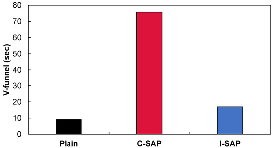 - V-funnel time, indicating flowability, was 8.3 times higher for concrete with C-SAP than for plain concrete, whereas it was around 1.85 times higher for plain for concrete with I-SAP.