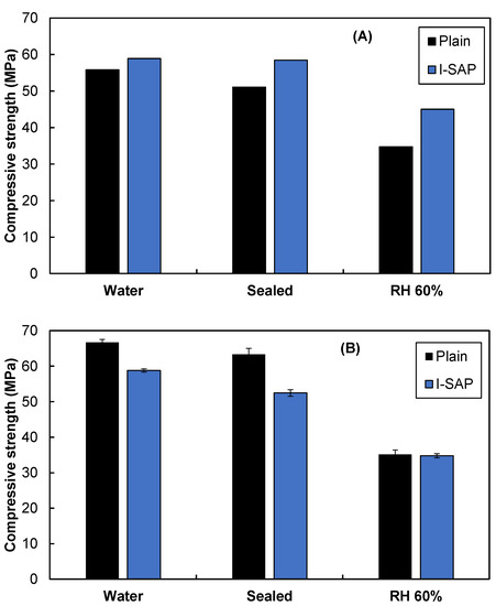 As discussed in Section 3.1, the conventional SAP has lower flowability than plain or I-SAP, and thus, additional water is necessary to maintain the flowability, which may reduce the strength. Therefore, in this study, the compressive strength and microstructure of cement paste and concrete with I-SAP was compared with plain concrete and paste, and C-SAP was not considered as it lowers strength [8,11,28]. Figure 4 shows the compressive strength of concrete and hydrated cement paste under water, sealed, and at 60% RH curing conditions. The concrete with I-SAP showed a higher strength as compared to the plain one. The strength is seen to increase by 6%, 14%, and 30% under water, sealed, and RH 60% curing conditions, respectively, where 60% RH significantly impacts the strength development. On the contrary, the addition of SAP reduced the strength of the hydrated cement paste by 12%, 17%, and 1% in cement pastes cured under water, sealed, and RH 60% curing conditions, respectively. There was no significant difference in the strength of the paste cured at RH 60%. The results obtained here for hydrated Portland cement paste are consistent with those of previous studies [10,20,21,22,23,24,25,26,27,28,29]: SAP either reduces or does not alter compressive strength. The release of water from SAP forms voids, which decreases the hydrated cement strength [5,43]. However, a more detailed investigation of the microstructure is necessary to understand the strength gain in concrete, especially for concrete cured at an RH of 60%.