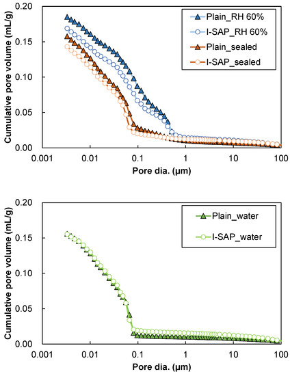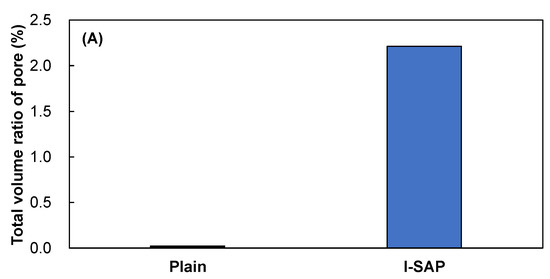 The large pores or voids formed by the release of water from SAP could reduce the strength of hydrated cement paste. Because SAP voids were too large to be detected by MIP measurements [27,52], μCT was performed on the hydrated cement paste samples cured in sealed conditions. Thereafter, a 3D particle size analysis was conducted for the obtained μCT images, and the results are shown in Figure 9. The volume ratio of SAP pores is shown in Figure 9A, which is approximately 2.2%. A similar measurement was conducted for the samples without SAP, and the ratio was approximately 0.022%, which might be due to the air formed during the mixing of cement paste. It is shown that the pores of SAP voids are 100 times larger than those of SAP-free mixture. Furthermore, the void sizes are mostly 0.1–10 mm (Figure 9B). Therefore, in the hydrated cement, SAP addition decreases the pores on the nanoscale, owing to the reaction of unhydrated cement (Figure 5), but the voids created by SAP control the strength of the hydrated cement paste.