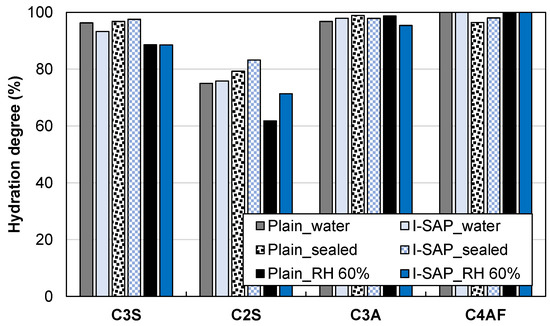 To evaluate the strength gain in concrete and loss in cement paste, the microstructures of the hydrated cement paste and concrete were analysed using various experimental techniques. A wide range (1–10 mm) of pore and void sizes exists in concrete, and thus, at least two methods (MIP and μCT) should be used to evaluate the pore structure in hydrated cement paste with SAP [48]. Figure 5 shows the cumulative pore volume of hydrated cement paste cured in water, sealed, and RH 60% conditions. The addition of SAP did not change the pore volume of cement paste cured in water, whereas it reduced the volume of pores diameter less than 600 nm in the seal-cured samples, which were cured in a 60% RH environment. In particular, the pore volume reduction was significant in this condition. This tendency is similar to that of the increase in the compressive strength of the concrete (Figure 4A). Therefore, the densification of the cement matrix, caused by hydration of clinker minerals, contributes to the strength development of concrete. The hydration rate of clinker minerals in the hydrated cement paste was calculated using XRD/Rietveld analysis, and the results are shown in Figure 6. The hydration degree of aluminate and ferrite is more than 95% with or without SAP in each curing condition, and thus, the effect of SAP on the reaction of these minerals is negligible. The hydration degree of alite in water and sealed curing is more than 93%, which is higher than that in the samples cured at RH 60%. Furthermore, SAP did not influence alite reaction. However, SAP increased the hydration degree of belite in the samples cured under sealed and RH 60% conditions by about 4% and 10%, respectively. The effect of SAP on belite hydration in the samples cured in water was insignificant as the curing provided enough water for hydration. Based on the reaction degree of the clinker minerals, the hydration of belite significantly contributes to the densification of the cement matrix, which reduces the porosity and increases the strength of concrete.